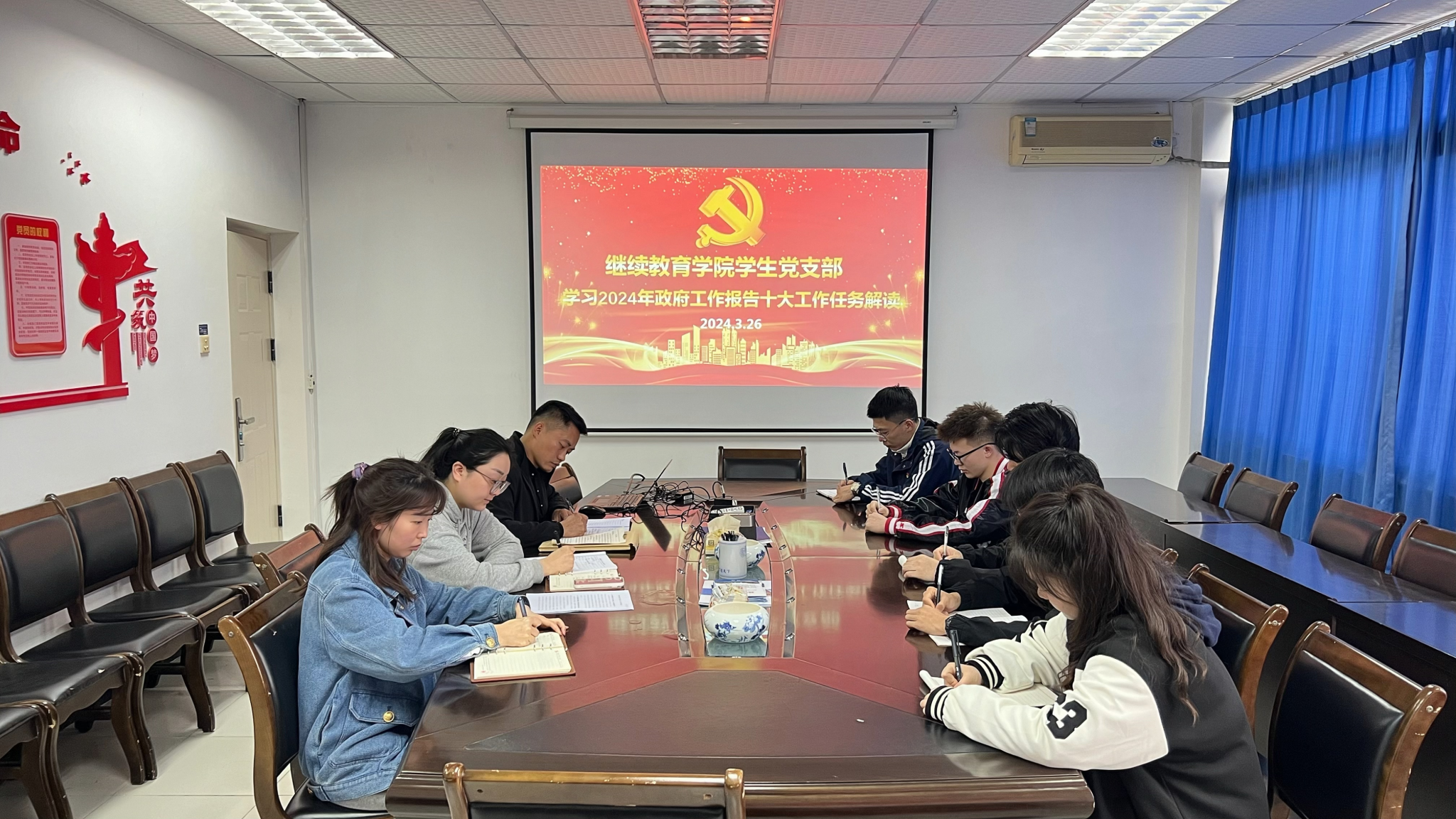 3月26日,学生党支部在学院二楼会议室组织学习2024年政府工作报告十大工作任务解读,旨在深化全体党员对国家发展大局的理解和把握,进一步激发党员们的使命感和责任感。本次活动由学生党支部组织委员王韶鸿同志领学,学生党支部全体党员参与。