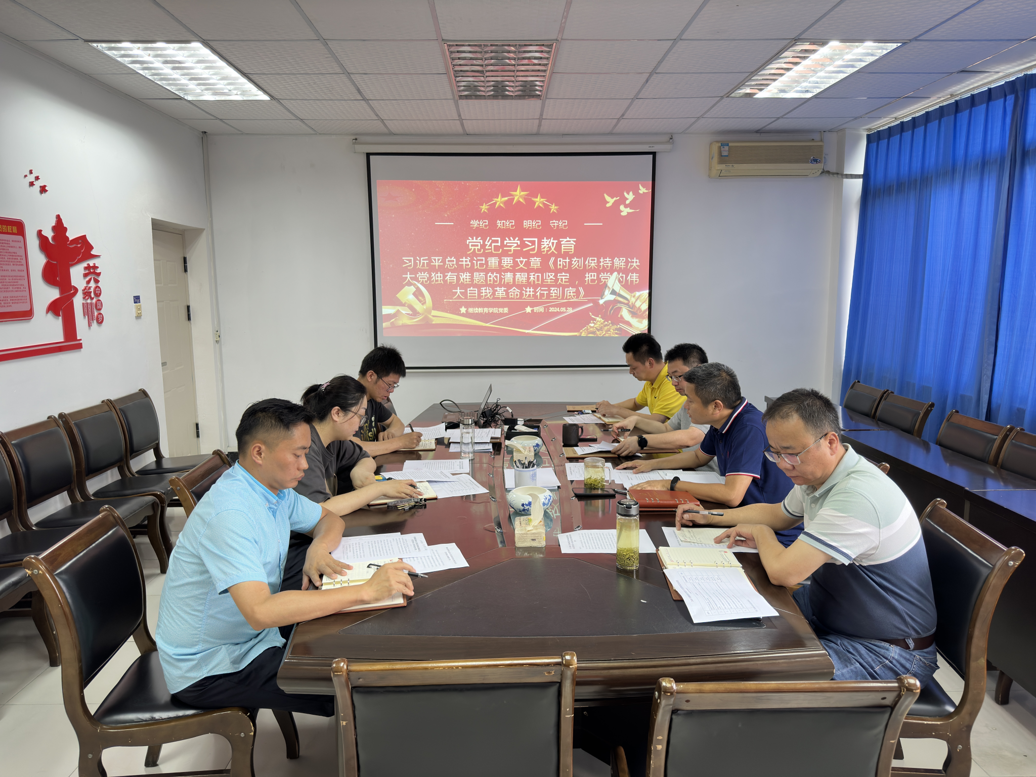 5月28日上午,继续教育学院党委理论学习中心组在学院二楼会议室开展党纪学习教育专题学习会,主要学习习近平总书记重要文章《时刻保持解决大党独有难题的清醒和坚定,把党的伟大自我革命进行到底》的重要指示精神,由学院党委书记易平领学,全体党委委员、党支部书记参加学习。