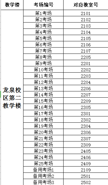 我校考场设置在成都信息工程大学龙泉校区(考场编号:第1考场--第25考场,另设置3个备用考场)。