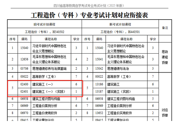 答:不可以。既包含理论考试又包含实践环节考核的课程,须取得理论考试和实践环节考核两部分的合格成绩方可顶替相应课程;如果只取得旧考试计划课程中理论考试或实践环节考核合格成绩,无法取得顶替新考试计划课程资格。比如,工程造价(专科)专业考试计划中的“建筑施工(一)”(课程代码02400)课程,考生如果只取得了原计划中“建筑施工(一)”(课程代码02400)合格成绩,那么需要继续参加“建筑施工(一)(实践)”(课程代码02401)考核并取得合格成绩,方可按照《四川省高等教育自学考试专业考试计划对应衔接表》进行对应顶替。考生也可以直接参加新考试计划课程的考试。