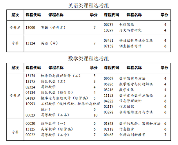 答:可以。考生如不考“英语(专)”(课程代码13124),可以选考“科技创新与社会发展”(课程代码03451)和“调查报告写作”(课程代码07158);考生不考“英语(专升本)”(课程代码13000),可以选考“创新思维”(课程代码06737)和“论文写作研究”(课程代码10397)。考生如不考“高等数学(一)”(课程代码00020)、“高等数学(工专)”(课程代码00022)、“高等数学(经管类)”(课程代码13125),可以选考“数学的观念、思想和方法”(课程代码01843)、“信息检索”(课程代码02118)、“创新与创新教育”(课程代码09468);考生如不考“高等数学(工本)(课程代码00023)”、“离散数学”(课程代码02324)、“概率论与数理统计(经管类)”(课程代码04183)、“线性代数(经管类)”(课程代码04184)、“工程数学(线性代数、概率论与数理统计)”(课程代码10993)、“概率论与数理统计(工)”(课程代码13174)、“线性代数(工)”(课程代码13175),可以选考“信息组织”(课程代码02117)、“数学文化”(课程代码03216)、“创新思维理论与方法”(课程代码03298)、“信息管理概论”(课程代码04222)、“数学思考与问题解决”(课程代码05826)、“数学思想与方法”(课程代码09097)、“数学史与数学方法论”(课程代码11153),选考课程学分不低于原课程学分。