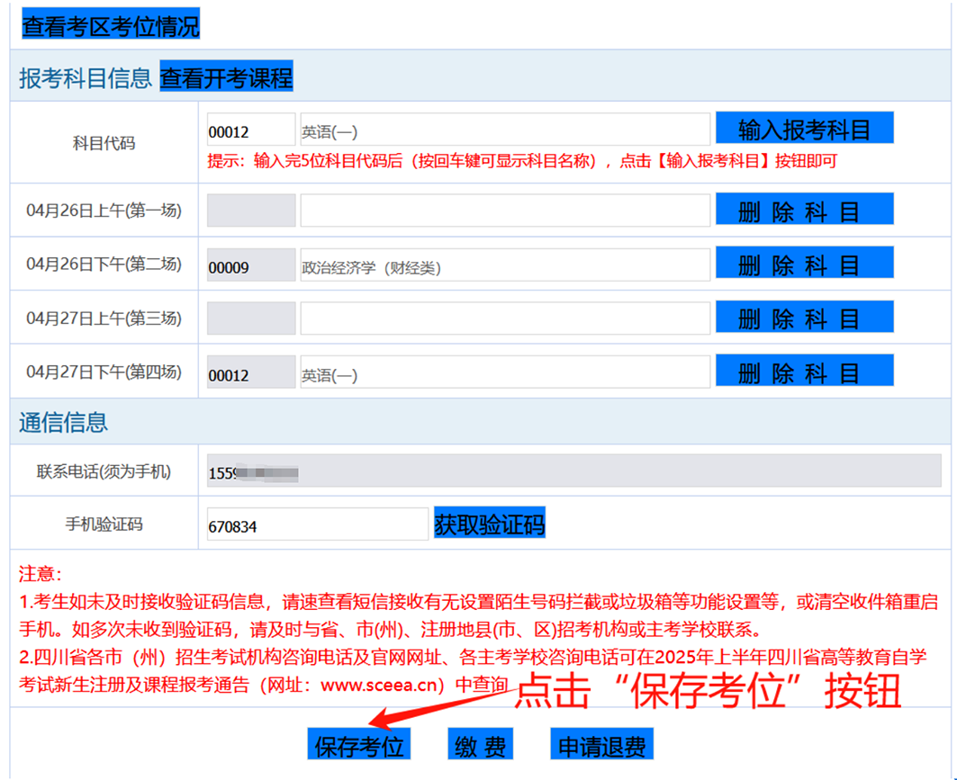 (1)报考信息保存成功后,在已保存的同县(市、区)同考试单元内,可更换课程:删除原保存的报考课程,输入同考试单元其他课程代码,发送验证码并填写,点击“保存考位”,即保存新的报考课程考位,此操作只用于替换已保存考位的报考课程。
