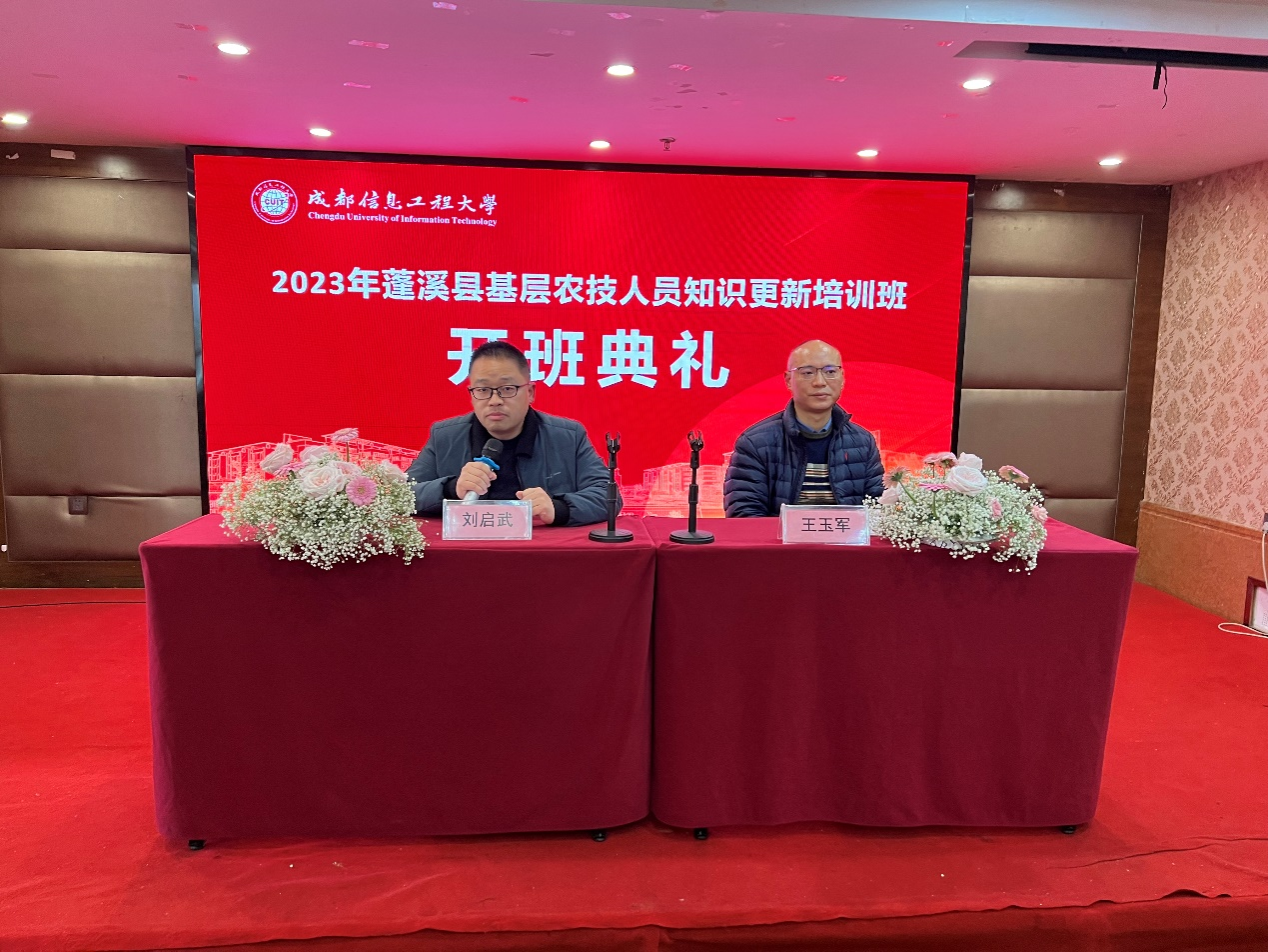 12月11日下午,由蓬溪县农业农村局主办,成都信息工程大学承办的2023年蓬溪县基层农技人员知识更新培训班顺利开班。蓬溪县农业农村局总畜牧师刘启武、成都信息工程大学培训中心主任助理王玉军出席开班典礼并致辞。