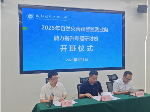 2025年7月8日,新疆维吾尔自治区自然灾害综合监测预警中心主办,成都信息工程大学承办的“2025年自然灾害预警监测业务能力提升专题研讨班”在学校航空港校区开班。新疆维吾尔自治区自然灾害综合监测预警中心党委副书记、主任华宁,新疆维吾尔自治区自然灾害综合监测预警中心机关纪委书记刘红亮,成都信息工程大学继续教育学院院长、培训中心主任周鑫等出席开班仪式。来自新疆各级自然灾害监测预警业务骨干及相关技术人员参加了研讨班学习。