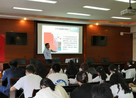 范逢春教授主要从科学有效的动力机制、严明的铁一般的纪律、德才兼备的干部队伍、宏大的信仰信念体系、完备的精神塑造系统五个方面进行展开论述学习党的二十大。他告诉同学们, 中国共产党所具有的无比坚强的领导力,是风雨来袭时中国人民最可靠的主心骨。中国共产党来自人民、植根人民,始终坚持一切为了人民、一切依靠人民,得到了最广大人民的衷心拥护和坚定支持,这是中国共产党领导力和执政力的广大而深厚的基础。他希望同学们认真学习二十大精神,树立崇高理念,坚持以人民为中心的发展思想,不断向党组织靠拢!