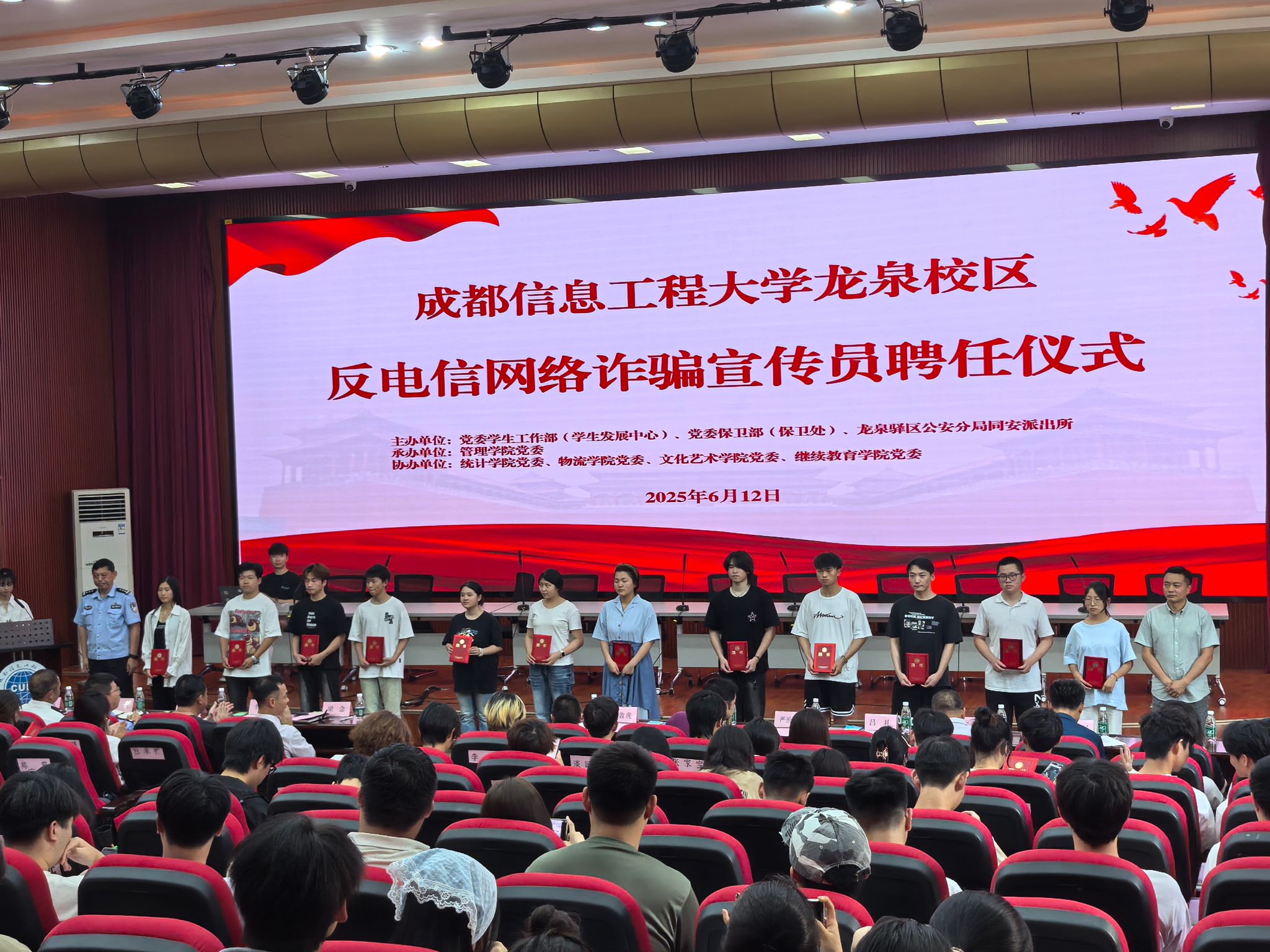 6月12日下午,由我校党委学生工作部、党委保卫部、龙泉驿区公安分局同安派出所主办的成都信息工程大学龙泉校区反电信网络诈骗宣传员聘任仪式暨反诈专题宣传讲座在学校龙泉校区三教学术报告厅举行。