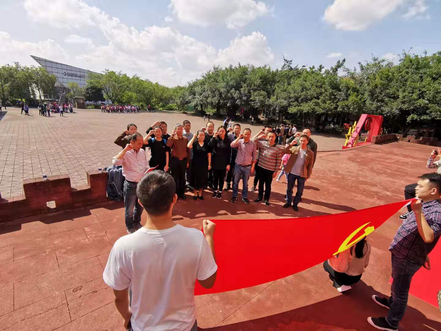 在中流砥柱广场,党总支组织全体党员开展“重温入党誓词”活动。面向党旗,党总支书记张驰同志带领全体党员干部庄严宣读入党誓词:“我志愿加入中国共产党,拥护党的纲领,遵守党的章程,履行党员义务,执行党的决定,严守党的纪律,保守党的秘密,对党忠诚,积极工作,为共产主义奋斗终身,随时准备为党和人民牺牲一切,永不叛党。”全体党员声音铿锵、句句千钧,神情庄重地许下对党和人民的承诺。