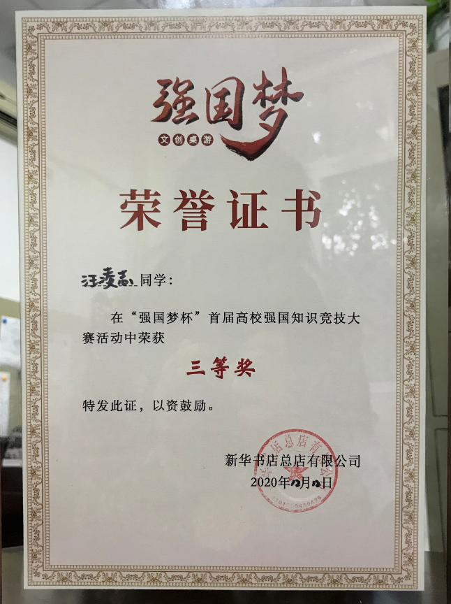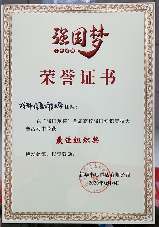 11月25日 ,以“学习新思想,筑梦新时代”为主题的“强国梦杯”首届高校强国知识竞技大赛于在全国8个城市64所高校同时启动,1300余名学生经过校园赛和城市赛产生了全国8强,我校继续教育学院学生汪凌志获得成都赛区第一名,并代表成都市赴京参加决赛。12月12日,本届高校强国知识竞技大赛决赛经过两轮激烈对决,汪凌志同学荣获全国三等奖,我校荣获最佳组织奖。