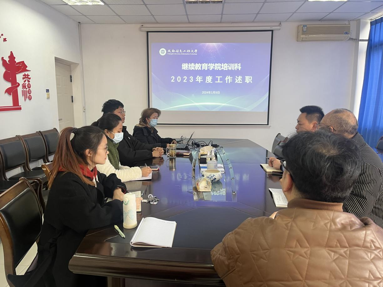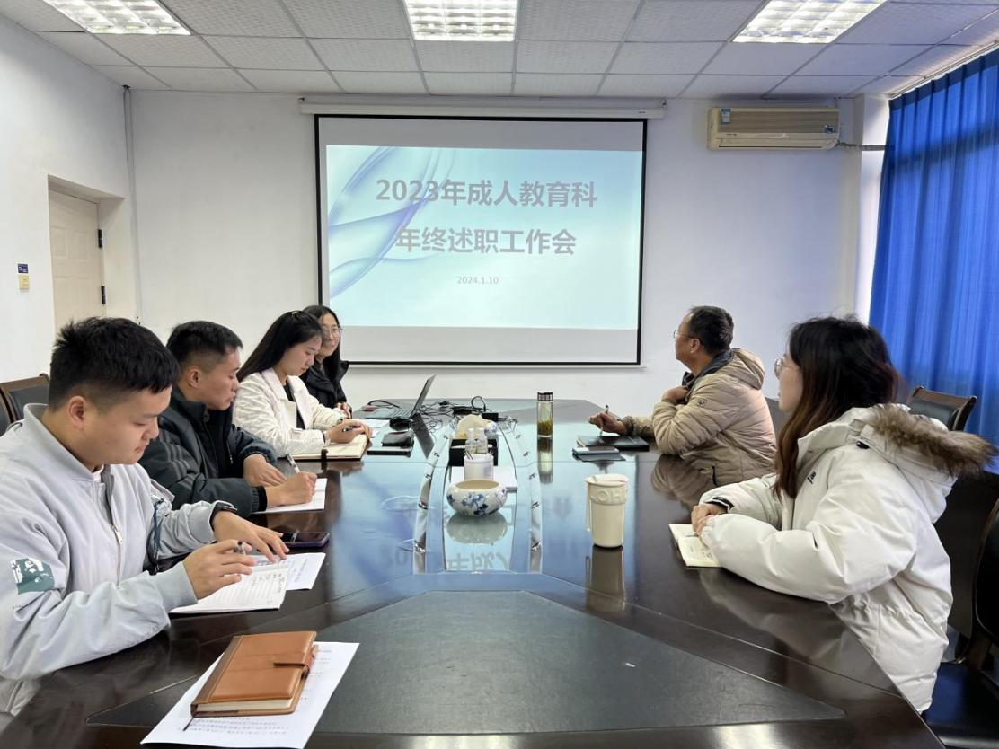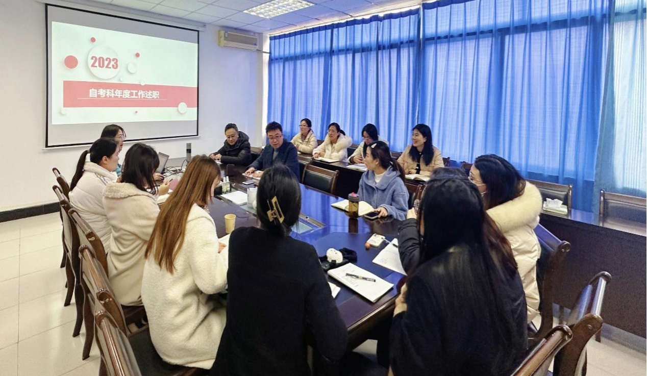 综合科、自考科、培训科、成教科各科室成员围绕政治思想及能力建设、工作成效、存在的不足、2024年度工作计划进行述职汇报。