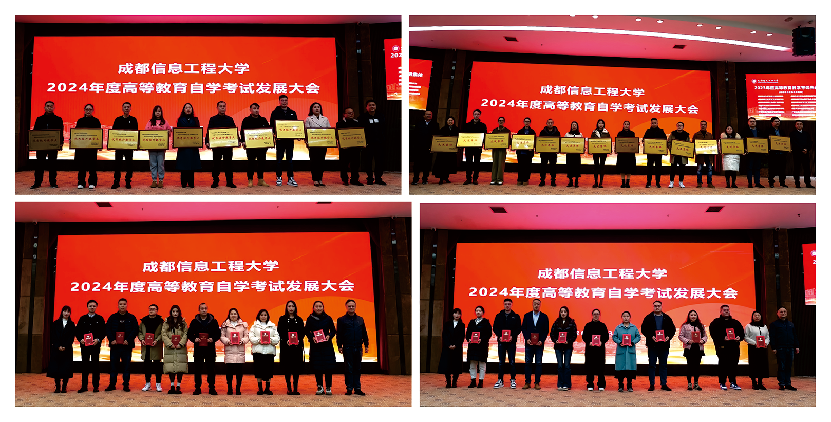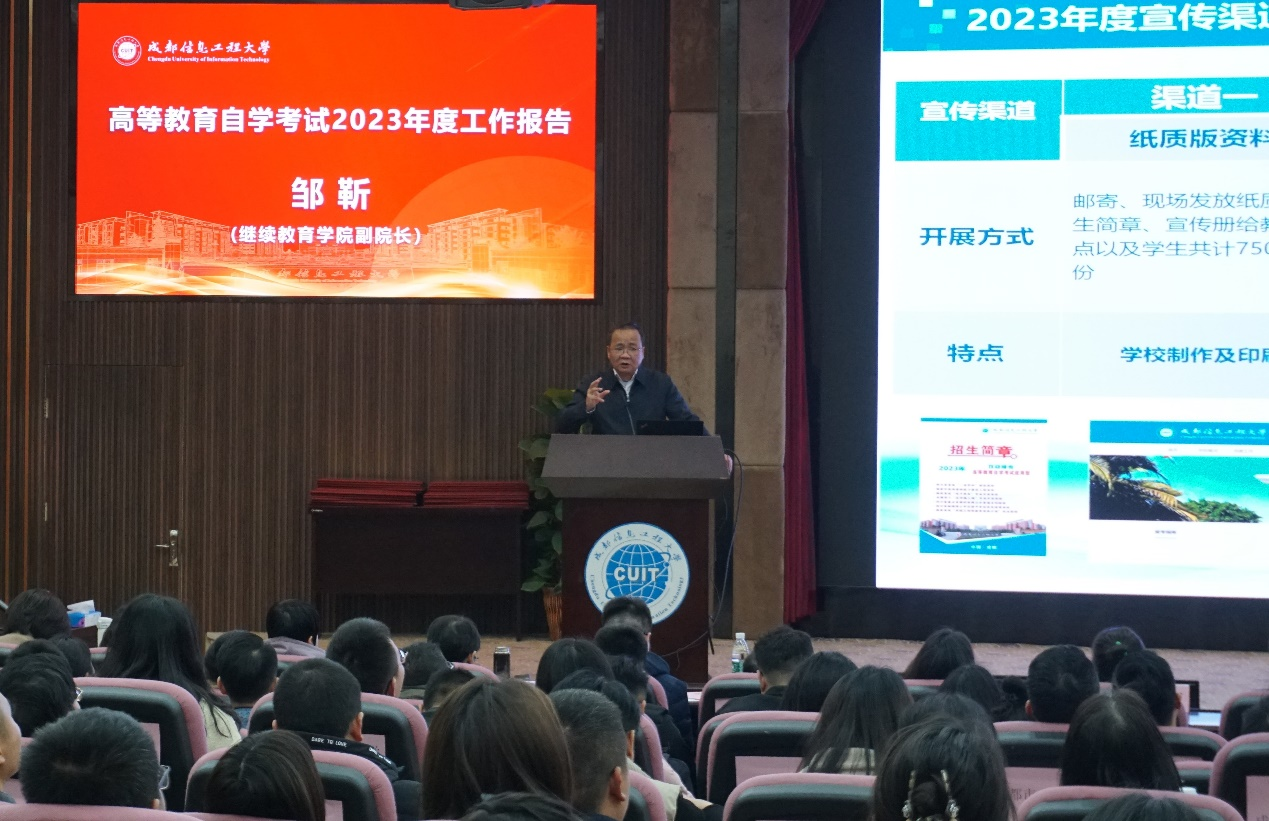 邹靳围绕“坚持走质量提升为核心的内涵式发展道路开创成信自考创新发展新局面”为主题作工作报告,回顾了学校2023年自学考试相关工作取得的成绩,分析当前面临的新形势和新挑战。他表示,学校将进一步优化专业设置,加强助学质量管理,以开放、融合的姿态携手各校外教学点共同促进自考高质量发展。随后,邹靳宣读本次表彰优秀校外教学点10个、先进集体14个、先进个人37人并现场颁奖。