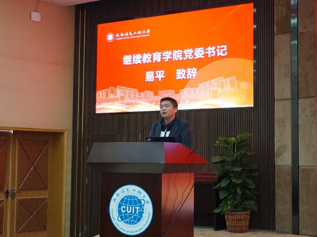 易平在大会上致辞,对各合作单位的领导及相关同志的到来表示热烈欢迎,易平强调,高等教育自学考试在培养应用型人才方面发挥着重要作用,各校外教学点要提高政治站位,优化工作举措,树牢底线思维,共同推动自学考试的高质量持续发展,并对我校继续教育工作的未来发展提出希望。