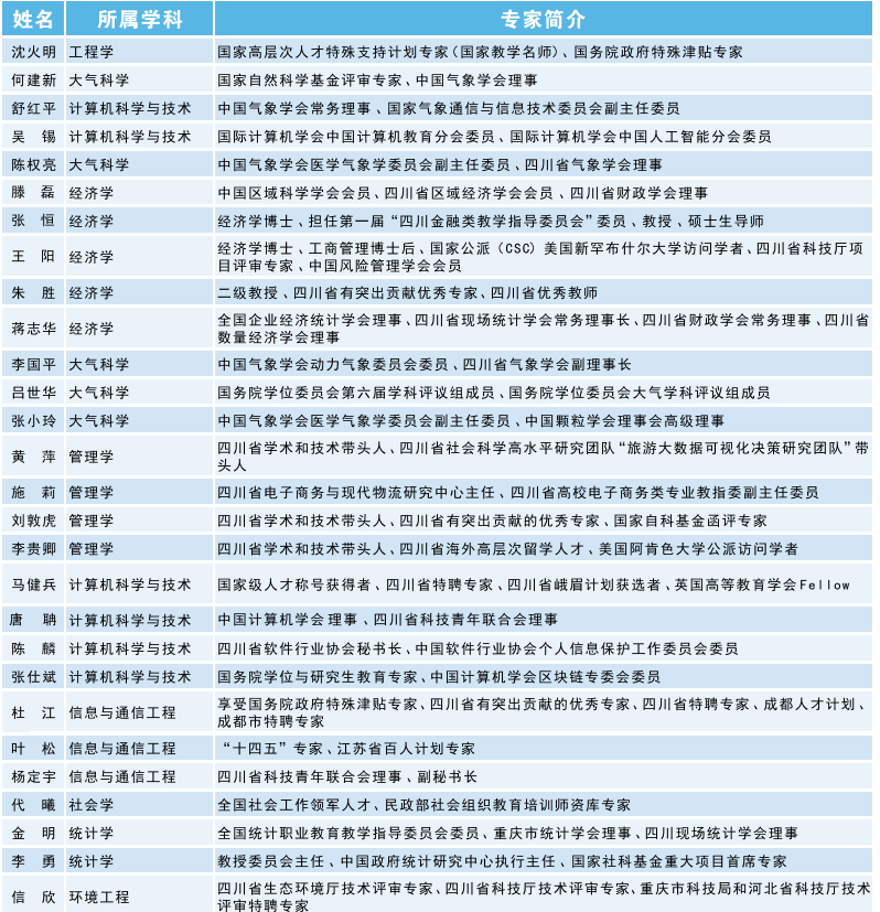 学校现有专任教师1600余人,其中博士800余人,高级职称650余人,有国务院政府特殊津贴专家、中科院百人计划、省学术和技术带头人、省突贡专家等100余人次;有全国模范教师、全国气象教学名师、省优秀教师、省教学名师10余人,同时聘有100余名院士、长江、杰青等高层次专家为我校兼职教授。本校教师担任校外兼职博士生导师28人,比较有影响力的主要学术兼职46项。